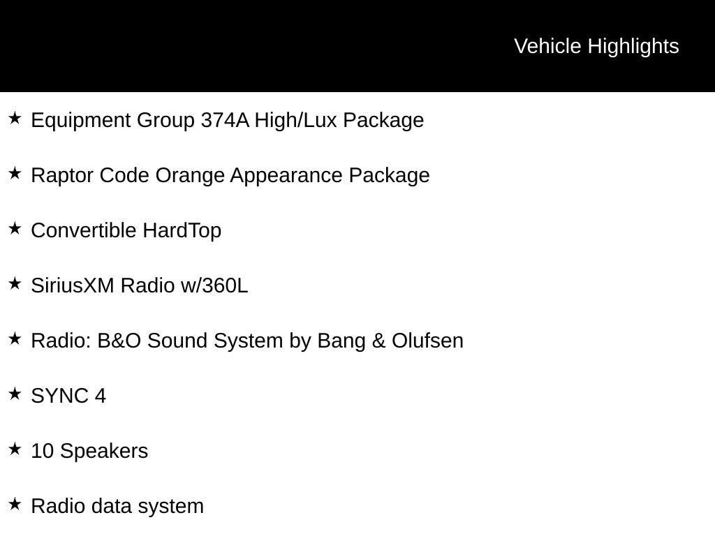 Elevate your driving experience with the Raptor Code Orange Appearance Package, which includes a bold and distinctive look with code orange beadlock kit, tow hooks, graphics package, and more. The Black Onyx, Leather-Trimmed/Vinyl Bucket Seats provide both style and comfort, while the High/Lux Equipment Group 374A package adds a wealth of premium features and technology.