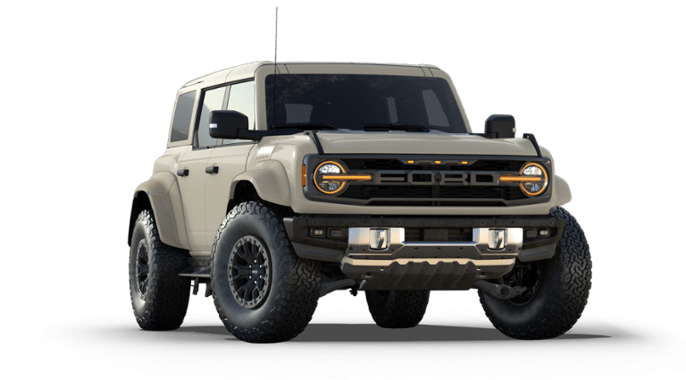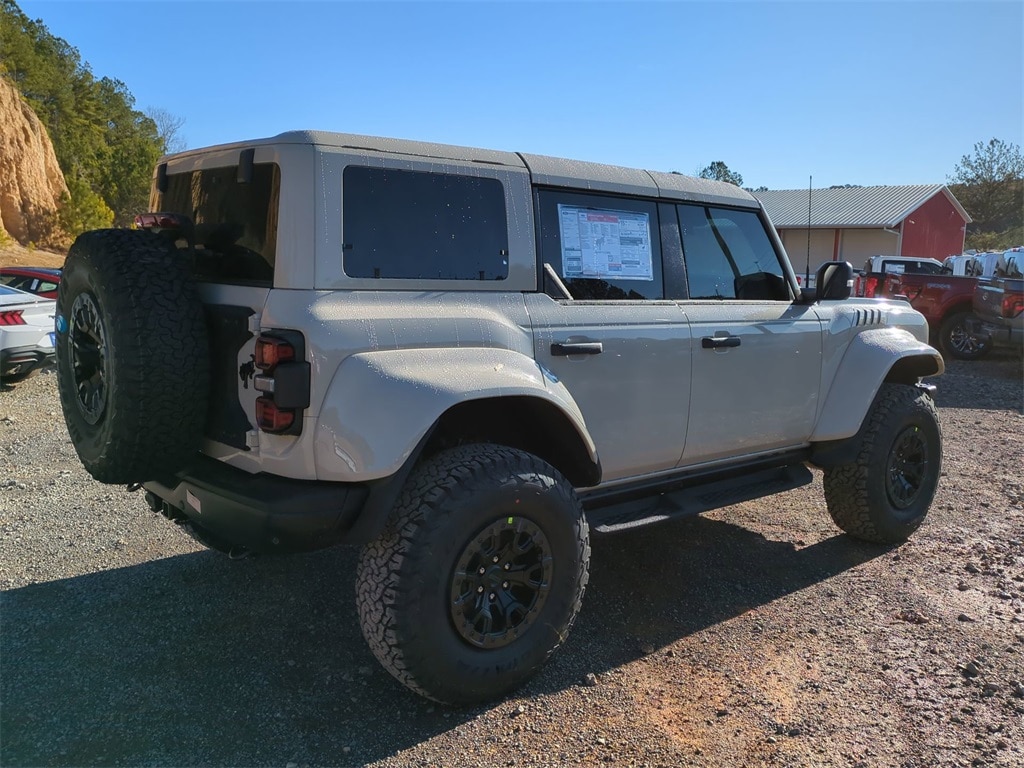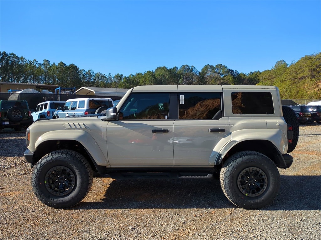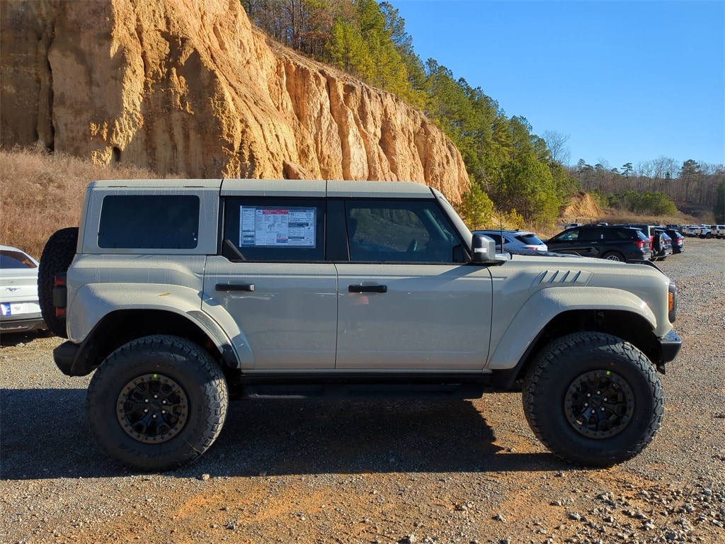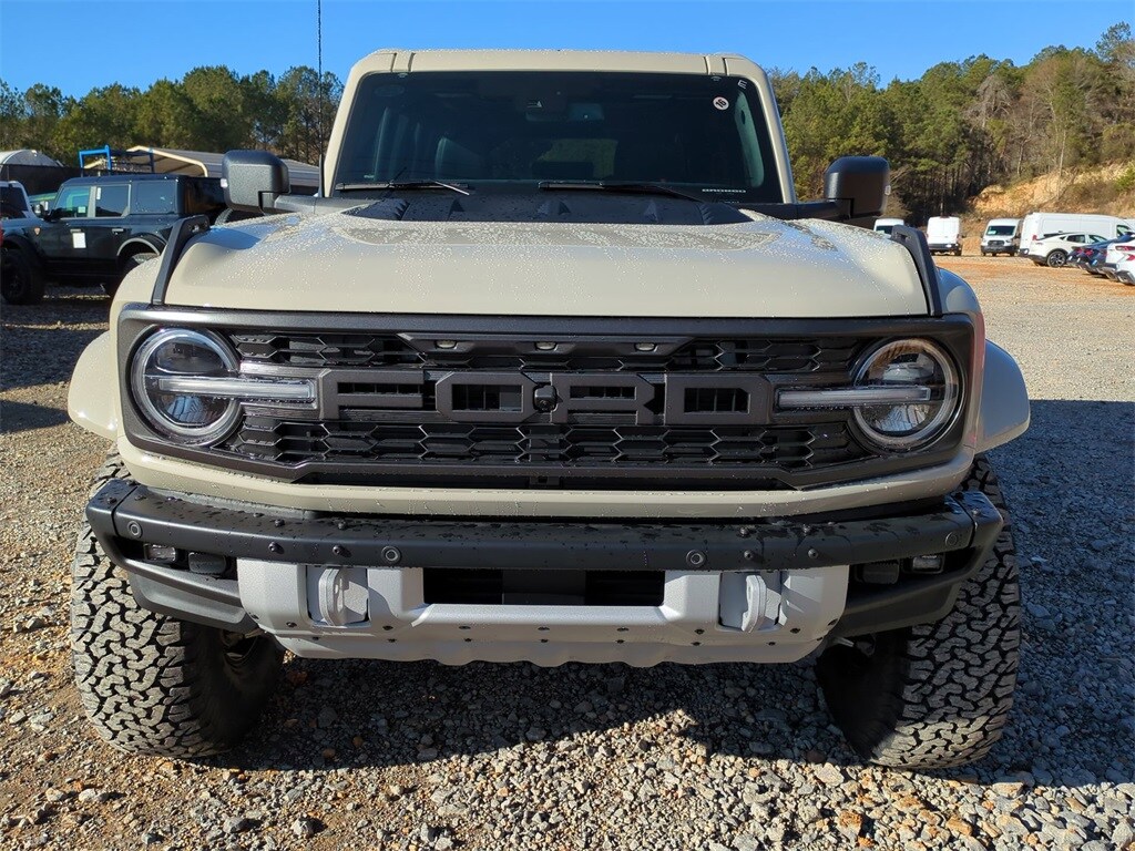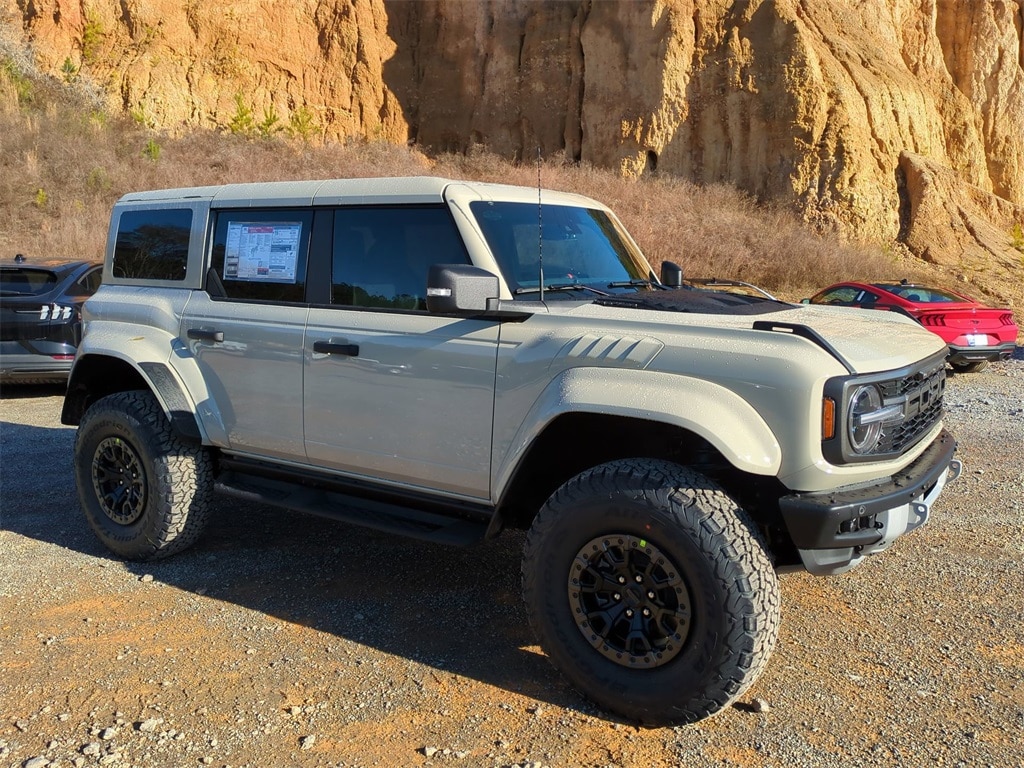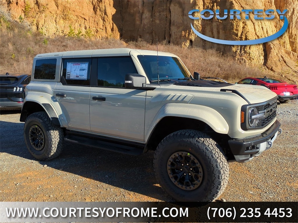 2025 Desert Sand 2025 Ford Bronco Raptor 4WD 3.0L EcoBoost V6 12 Speakers, 4-Wheel Disc Brakes, ABS brakes, Air Conditioning, Alloy wheels, AM/FM radio: SiriusXM with 360L, Auto High-beam Headlights, Auto-dimming Rear-View mirror, Automatic temperature control, Brake assist, Compass, Connected Navigation, Convertible HardTop, Convertible roof lining, Delay-off headlights, Driver door bin, Driver vanity mirror, Dual front impact airbags, Dual front side impact airbags, Electronic Stability Control, Emergency communication system: 911 Assist, Exterior Parking Camera Rear, Front anti-roll bar, Front Bucket Seats, Front Center Armrest, Front dual zone A/C, Front fog lights, Front reading lights, Front wheel independent suspension, Fully automatic headlights, Garage door transmitter, Glass rear window, Heated door mirrors, Heated front seats, Heated steering wheel, Illuminated entry, Integrated roll-over protection, Internet access capable: FordPass Connect, Leather Shift Knob, Low tire pressure warning, Marine Grade Vinyl Bucket Seats, Navigation system: Connected Navigation, Occupant sensing airbag, Outside temperature display, Overhead airbag, Overhead console, Panic alarm, Passenger door bin, Passenger vanity mirror, Power door mirrors, Power steering, Power windows, Radio data system, Radio: B&O Sound System by Bang & Olufsen, Rear anti-roll bar, Rear seat center armrest, Rear window defroster, Rear window wiper, Remote keyless entry, Security system, SiriusXM w/360L, Speed control, Split folding rear seat, Steering wheel mounted audio controls, SYNC 4, Tachometer, Telescoping steering wheel, Tilt steering wheel, Traction control, Trip computer, Turn signal indicator mirrors, Variably intermittent wipers, Voltmeter, and Wheels: 17" Black High Gloss-Painted Aluminum Courtesy Ford and Lincoln of Rome 101 Hwy 411 E Rome, Ga 30161 ROMEFORDLINC.COM 706.235.4453.