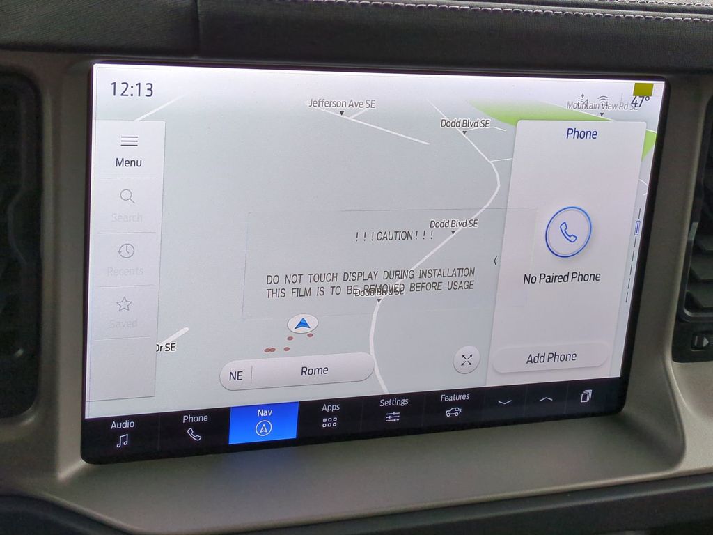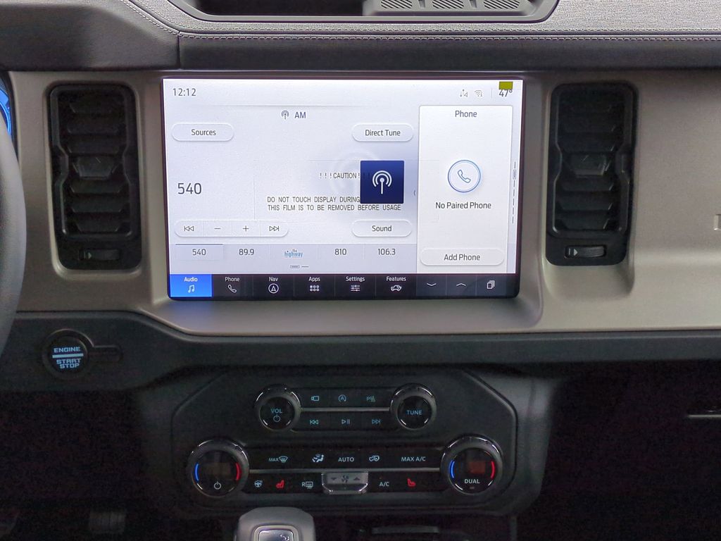 2025 Azure Gray Metallic Tri-Coat 2025 Ford Bronco Outer Banks 4WD 2.3L EcoBoost I-4 Equipment Group 314A Lux Package (360-Degree Camera, Adaptive Cruise Control, Evasive Steering Assist, Front Parking Sensors, Information on Demand Panel, Radio: B&O Sound System by Bang & Olufsen, Sideview Mirrors, and Universal Garage Door Opener), 18" Bright Machined Aluminum Wheels, 3.73 Axle Ratio, 4-Wheel Disc Brakes, 7 Speakers, ABS brakes, Air Conditioning, Alloy wheels, AM/FM radio: SiriusXM with 360L, AM/FM Stereo, Auto High-beam Headlights, Auto-dimming Rear-View mirror, Automatic temperature control, Brake assist, Carbonized Gray Molded-In-Color Hard Top, Compass, Connected Navigation, Delay-off headlights, Driver door bin, Driver vanity mirror, Dual front impact airbags, Dual front side impact airbags, Electronic Stability Control, Emergency communication system: 911 Assist, Exterior Parking Camera Rear, Front anti-roll bar, Front Bucket Seats, Front Center Armrest, Front dual zone A/C, Front fog lights, Front reading lights, Front wheel independent suspension, Fully automatic headlights, Hard Top Sound Deadening Headliner, Heated door mirrors, Heated front seats, Heated Leather-Trimmed/Vinyl Bucket Seats, Heated steering wheel, Illuminated entry, Integrated roll-over protection, Internet access capable: FordPass Connect, Leather Shift Knob, Low tire pressure warning, Navigation system: Connected Navigation, Occupant sensing airbag, Outside temperature display, Overhead airbag, Overhead console, Panic alarm, Passenger door bin, Passenger vanity mirror, Power door mirrors, Power driver seat, Power passenger seat, Power steering, Power windows, Radio data system, Rear seat center armrest, Rear-Window Defroster & Washer, Remote keyless entry, Security system, SiriusXM w/360L, Speed control, Split folding rear seat, Steering wheel mounted audio controls, SYNC 4, Tachometer, Telescoping steering wheel, Tilt steering wheel, Traction control, Trip computer, Variably intermittent wipers, and Voltmeter Courtesy Ford and Lincoln of Rome 101 Hwy 411 E Rome, Ga 30161 ROMEFORDLINC.COM 706.235.4453.