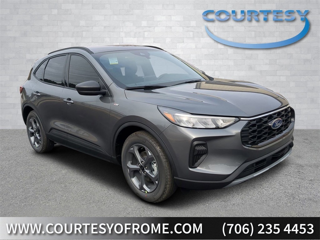 2025 Carbonized Gray Metallic 2025 Ford Escape ST-Line FWD 2.5L iVCT 8" Color Touchscreen, Auto LED Headlights, Backup Camera, Blind Spot Monitoring, BLIS w/ Cross Traffic Alert, **Not all Pre-Owned Cars/Trucks come with 2 keys and/or 2 remotes**, 4D Sport Utility, 2.5L iVCT, eCVT, 2.91 Axle Ratio, Electronic Fuel Door Release, Equipment Group 301A, Neutral Towing Capability, Pedestrian Alert Sounder, Power Liftgate. Equipment Group 301A (2.91 Axle Ratio, Electronic Fuel Door Release, Neutral Towing Capability, and Pedestrian Alert Sounder), 4D Sport Utility, 2.5L iVCT, eCVT, Power Liftgate, 4-Wheel Disc Brakes, 6 Speakers, ABS brakes, Air Conditioning, Alloy wheels, AM/FM radio: SiriusXM, AM/FM Stereo, Auto High-beam Headlights, Automatic temperature control, Brake assist, Bumpers: body-color, Compass, Delay-off headlights, Driver door bin, Driver vanity mirror, Dual front impact airbags, Dual front side impact airbags, Electronic Stability Control, Emergency communication system: SYNC 4 911 Assist, FordPass Connect, Four wheel independent suspension, Front anti-roll bar, Front Bucket Seats, Front Center Armrest, Front dual zone A/C, Front reading lights, Fully automatic headlights, Illuminated entry, Knee airbag, Low tire pressure warning, Occupant sensing airbag, Outside temperature display, Overhead airbag, Overhead console, Panic alarm, Passenger door bin, Passenger vanity mirror, Power door mirrors, Power driver seat, Power steering, Power windows, Radio data system, Rear anti-roll bar, Rear reading lights, Rear seat center armrest, Rear window defroster, Rear window wiper, Remote keyless entry, Speed control, Speed-sensing steering, Speed-Sensitive Wipers, Split folding rear seat, Spoiler, Sport steering wheel, Steering wheel mounted audio controls, SYNC 4, Tachometer, Telescoping steering wheel, Tilt steering wheel, Traction control, Trip computer, Variably intermittent wipers, Vinyl/Cloth Front Sport Contour Bucket Seats, and Wheels: 18" Rock Metallic Painted Aluminum Courtesy Ford and Lincoln of Rome 101 Hwy 411 E Rome, Ga 30161 ROMEFORDLINC.COM 706.235.4453.