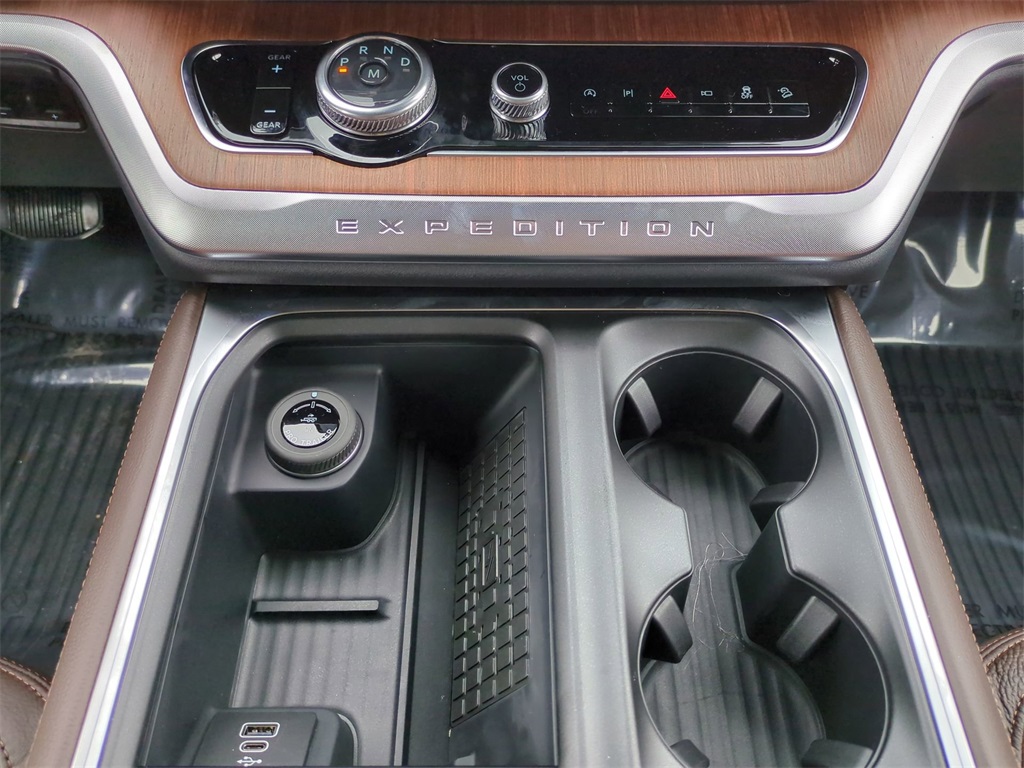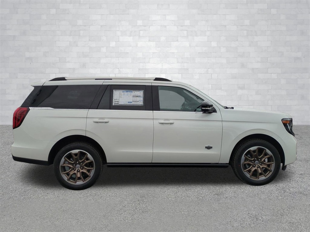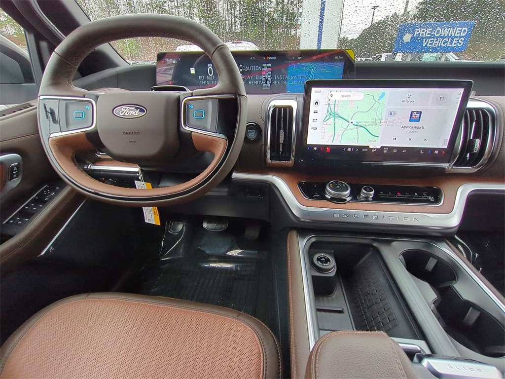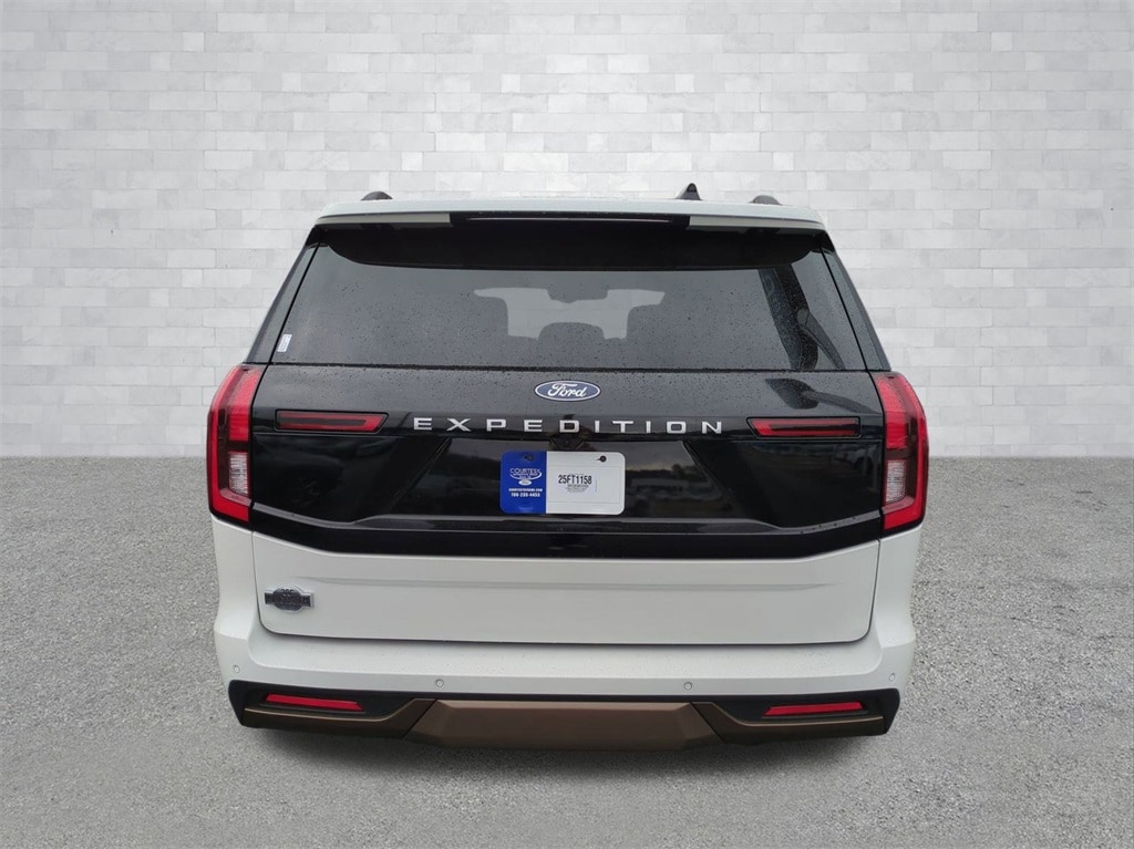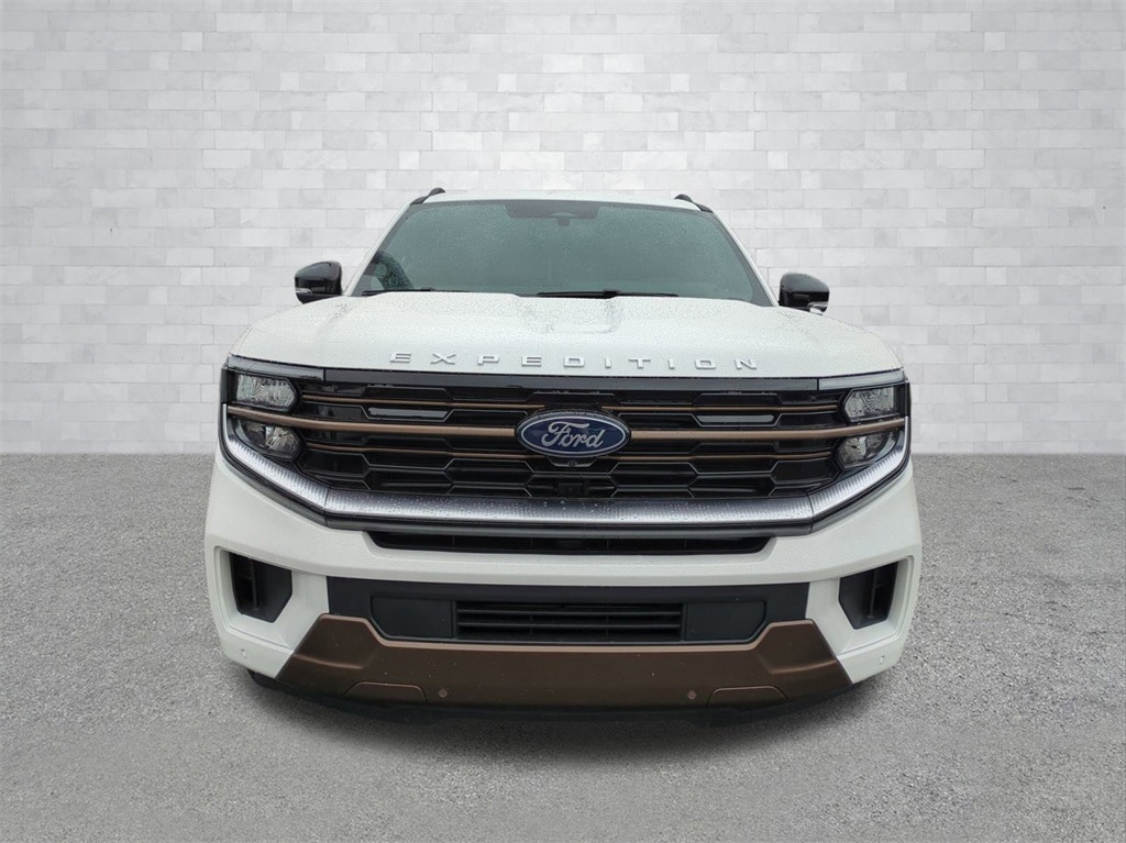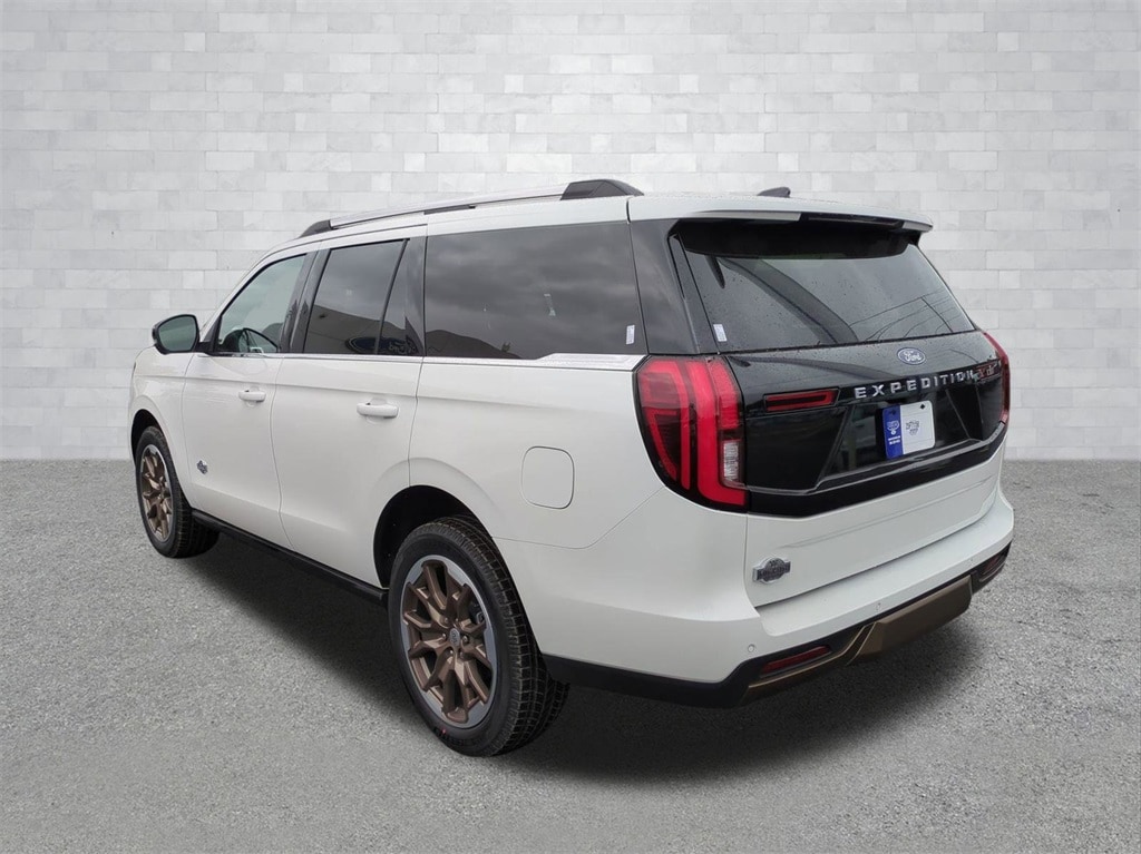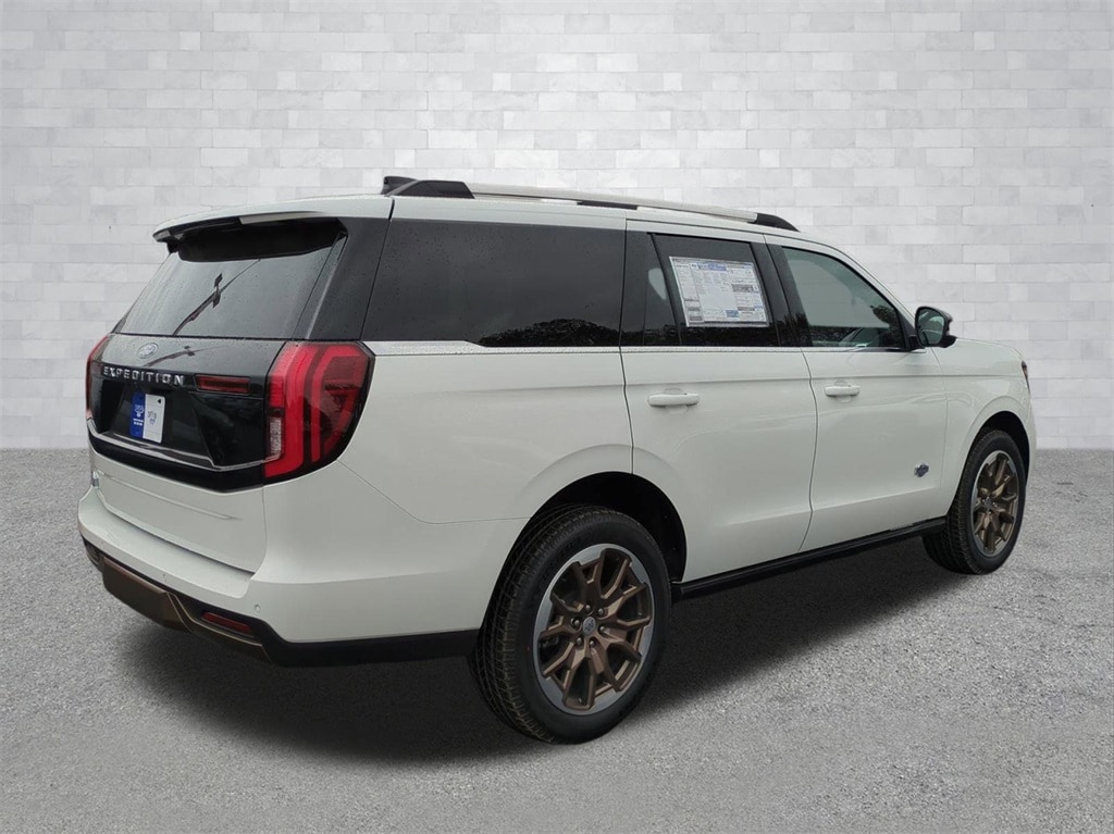2025 White Metallic 2025 Ford Expedition King Ranch 4WD EcoBoost 3.5L V6 GTDi DOHC 24V Twin Turbocharged 4WD. Connectivity Package (One-Time Purchase), Equipment Group 400A Standard Package (BlueCruise Equipped (1-Year Plan)), 4WD, 22 Speakers, 3.73 Axle Ratio, 3rd row seats: split-bench, 4-Wheel Disc Brakes, ABS brakes, Adaptive suspension, Adjustable pedals, Air Conditioning, Alloy wheels, AM/FM radio: SiriusXM with 360L, Apple CarPlay/Android Auto, Auto High-beam Headlights, Auto-dimming door mirrors, Auto-dimming Rear-View mirror, Automatic temperature control, Brake assist, Bumpers: body-color, Compass, Delay-off headlights, Driver door bin, Driver vanity mirror, Dual front impact airbags, Dual front side impact airbags, Electronic Stability Control, Emergency communication system: 911 Assist, Exterior Parking Camera Rear, Floor Liners, Front & Second Rows, Four wheel independent suspension, Front anti-roll bar, Front Bucket Seats, Front Center Armrest, Front dual zone A/C, Front reading lights, Fully automatic headlights, Garage door transmitter, Genuine wood dashboard insert, Genuine wood door panel insert, Heated door mirrors, Heated front seats, Heated rear seats, Heated steering wheel, Heated/Vent Prem Del Rio Lthr Fr Captain's Chairs, Illuminated entry, Leather steering wheel, Low tire pressure warning, Memory seat, Navigation System, Occupant sensing airbag, Outside temperature display, Overhead airbag, Overhead console, Panic alarm, Passenger door bin, Passenger vanity mirror, Pedal memory, Power door mirrors, Power driver seat, Power moonroof: Vista Roof, Power passenger seat, Power steering, Power windows, Radio data system, Radio: B&O Unleashed Sound System by Bang & Olufsen, Rain sensing wipers, Rear air conditioning, Rear anti-roll bar, Rear reading lights, Rear window defroster, Rear window wiper, Reclining 3rd row seat, Remote keyless entry, Security system, SiriusXM w/360L, Speed control, Speed-sensing steering, Speed-Sensitive Wipers, Split folding rear seat, Spoiler, Steering wheel memory, Steering wheel mounted audio controls, Tachometer, Telescoping steering wheel, Tilt steering wheel, Traction control, Trip computer, Turn signal indicator mirrors, Variably intermittent wipers, Ventilated front seats, Voltmeter, and Wheels: 22" Sinister Brown w/Diamond Cut Face Alum Courtesy Ford and Lincoln of Rome 101 Hwy 411 E Rome, Ga 30161 ROMEFORDLINC.COM 706.235.4453.