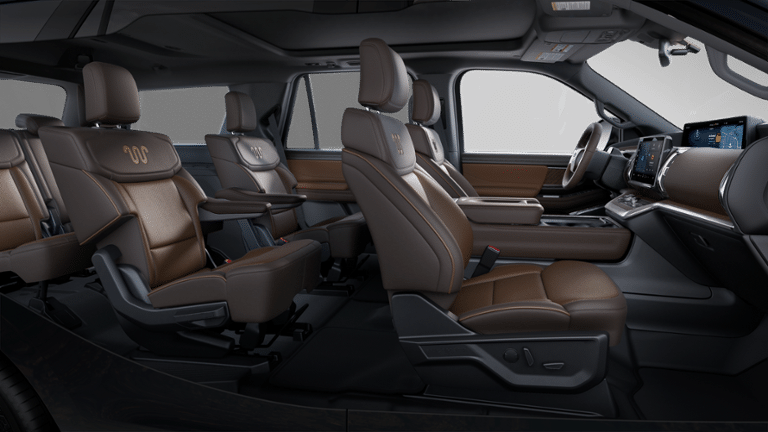 2025 Agate Black Metallic 2025 Ford Expedition King Ranch 4WD EcoBoost 3.5L V6 GTDi DOHC 24V Twin Turbocharged 4WD. 4WD, 22 Speakers, 3.73 Axle Ratio, 3rd row seats: split-bench, 4-Wheel Disc Brakes, ABS brakes, Adaptive suspension, Adjustable pedals, Air Conditioning, Alloy wheels, AM/FM radio: SiriusXM with 360L, Apple CarPlay/Android Auto, Auto High-beam Headlights, Auto-dimming door mirrors, Auto-dimming Rear-View mirror, Automatic temperature control, BlueCruise Equipped (1-Year Plan), Brake assist, Bumpers: body-color, Compass, Delay-off headlights, Driver door bin, Driver vanity mirror, Dual front impact airbags, Dual front side impact airbags, Electronic Stability Control, Emergency communication system: 911 Assist, Exterior Parking Camera Rear, Four wheel independent suspension, Front anti-roll bar, Front Bucket Seats, Front Center Armrest, Front dual zone A/C, Front reading lights, Fully automatic headlights, Garage door transmitter, Genuine wood dashboard insert, Genuine wood door panel insert, Heated door mirrors, Heated front seats, Heated rear seats, Heated steering wheel, Heated/Vent Prem Del Rio Lthr Fr Captain's Chairs, Illuminated entry, Leather steering wheel, Low tire pressure warning, Memory seat, Navigation System, Occupant sensing airbag, Outside temperature display, Overhead airbag, Overhead console, Panic alarm, Passenger door bin, Passenger vanity mirror, Pedal memory, Power door mirrors, Power driver seat, Power moonroof: Vista Roof, Power passenger seat, Power steering, Power windows, Radio data system, Radio: B&O Unleashed Sound System by Bang & Olufsen, Rain sensing wipers, Rear air conditioning, Rear anti-roll bar, Rear reading lights, Rear window defroster, Rear window wiper, Reclining 3rd row seat, Remote keyless entry, Security system, SiriusXM w/360L, Speed control, Speed-sensing steering, Speed-Sensitive Wipers, Split folding rear seat, Spoiler, Steering wheel memory, Steering wheel mounted audio controls, Tachometer, Telescoping steering wheel, Tilt steering wheel, Traction control, Trip computer, Turn signal indicator mirrors, Variably intermittent wipers, Ventilated front seats, Voltmeter, and Wheels: 22" Sinister Brown w/Diamond Cut Face Alum Courtesy Ford and Lincoln of Rome 101 Hwy 411 E Rome, Ga 30161 ROMEFORDLINC.COM 706.235.4453.