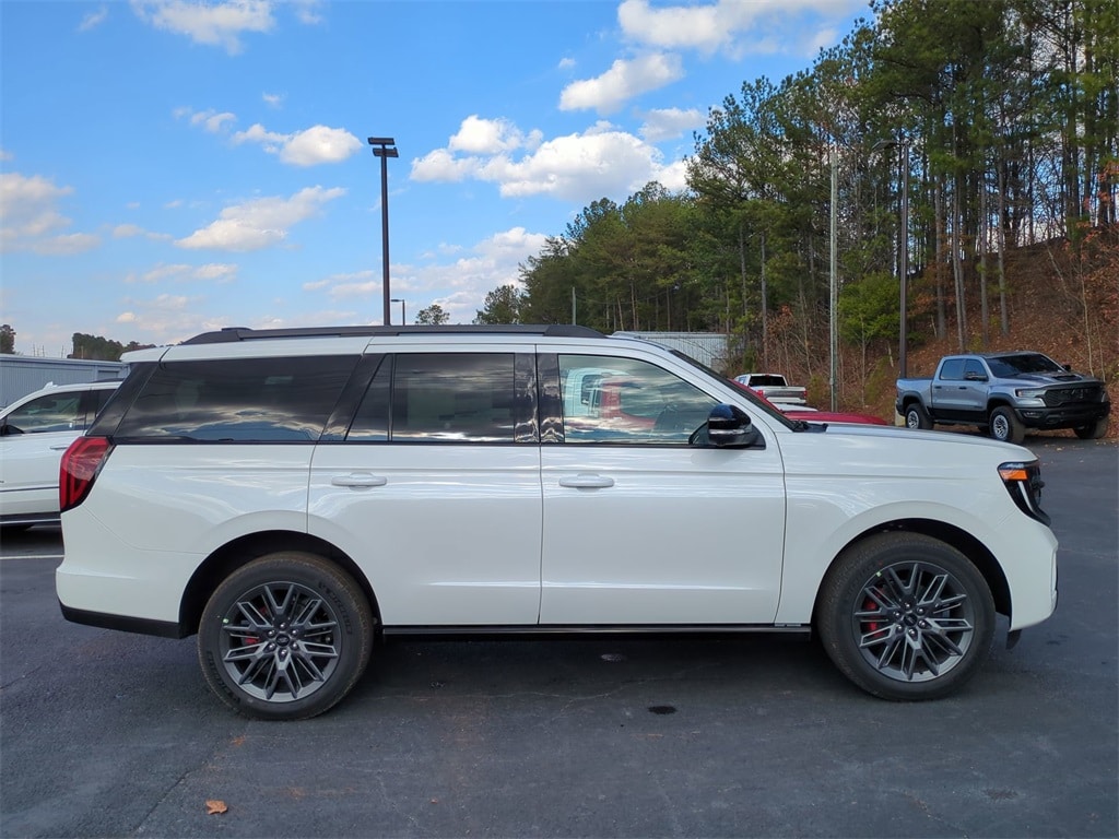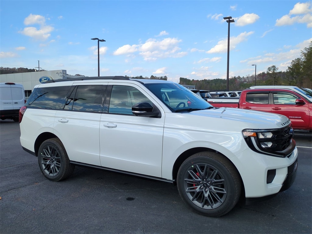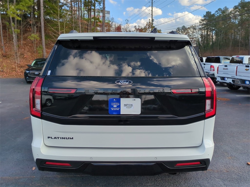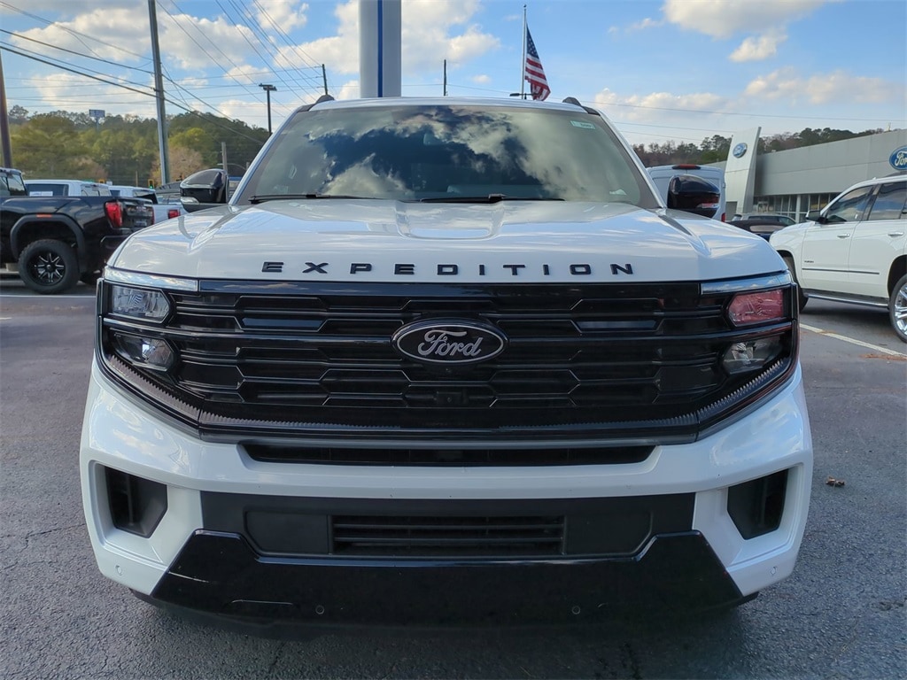 2025 Star White Metallic Tri-Coat 2025 Ford Expedition Platinum Stealth 4WD 3.5L V6 13.2" LCD Centerstack Touchscreen, 24" Cluster Pano Display, 3rd Row Seating, Adaptive Ride Package, Auto LED Headlights, Autoride Suspension Package, Bi Xenon Headlamp Package, Bluetooth w/ Audio Streaming, Hill Descent Control, Hill Start Assist, Intersection Assist, Memory Package, Multi Zone Climate Control, Panoramic Sunroof/Moonroof, Power Mirror Package, Power Package, Push Button Start, Remote Start, Wireless Charging Pad, 4D Sport Utility, 3.5L V6, 10-Speed Automatic, 4WD, 2nd Row Power-Folding Captain's Chairs, Black Belt Molding, Black Expedition Lettering On Hood, Black Headlamp Bezel w/Ebony Trim Applique, Black Platinum Badge On Tailgate, Black Roof Rails, Carbon Black Front Bumper/Fascia, Connectivity Package (One-Time Purchase), Continuous Control Damping Suspension, Driver's Package, Engine Sound Enhancer, Equipment Group 600A Standard Package, High Flow Exhaust System, Navigation System, Radio: B&O Unleashed Sound System by Bang & Olufsen, Rain sensing wipers, Rear Side Windows Laminated Glass, Rear window wiper, Red Brake Calipers, Signature Grille Lighting, SiriusXM w/360L, Speed-Sensitive Wipers, Stealth Appearance Package, Stealth Performance Package, Wheels: 22" Magnetite Painted Aluminum. Connectivity Package (One-Time Purchase), Driver's Package (Continuous Control Damping Suspension, Radio: B&O Unleashed Sound System by Bang & Olufsen, and SiriusXM w/360L), Equipment Group 600A Standard Package (2nd Row Power-Folding Captain's Chairs), Stealth Appearance Package (Black Belt Molding, Black Expedition Lettering On Hood, Black Headlamp Bezel w/Ebony Trim Applique, Black Platinum Badge On Tailgate, Black Roof Rails, Carbon Black Front Bumper/Fascia, Engine Sound Enhancer, Rear Side Windows Laminated Glass, and Signature Grille Lighting), Stealth Performance Package (High Flow Exhaust System, Red Brake Calipers, and Wheels: 22" Magnetite Painted Aluminum), 4D Sport Utility, 3.5L V6, 10-Speed Automatic, 4WD, Navigation System, Rain sensing wipers, Rear window wiper, Speed-Sensitive Wipers, 10 Speakers, 3.73 Axle Ratio, 3rd row seats: split-bench, 4-Wheel Disc Brakes, ABS brakes, Adjustable pedals, Air Conditioning, Alloy wheels, AM/FM radio: SiriusXM with 360L, Apple CarPlay/Android Auto, Auto High-beam Headlights, Auto-dimming door mirrors, Auto-dimming Rear-View mirror, Automatic temperature control, Brake assist, Bumpers: body-color, Compass, Delay-off headlights, Driver door bin, Driver vanity mirror, Dual front impact airbags, Dual front side impact airbags, Electronic Stability Control, Emergency communication system: 911 Assist, Exterior Parking Camera Rear, Four wheel independent suspension, Front anti-roll bar, Front Bucket Seats, Front Center Armrest, Front dual zone A/C, Front reading lights, Fully automatic headlights, Garage door transmitter, Genuine wood dashboard insert, Genuine wood door panel insert, Heated & Ventilated Leather Front Captain's Chairs, Heated door mirrors, Heated front seats, Heated rear seats, Heated steering wheel, Illuminated entry, Leather steering wheel, Low tire pressure warning, Memory seat, Occupant sensing airbag, Outside temperature display, Overhead airbag, Overhead console, Panic alarm, Passenger door bin, Passenger vanity mirror, Pedal memory, Power door mirrors, Power driver seat, Power moonroof: Vista Roof, Power passenger seat, Power steering, Power windows, Radio data system, Radio: B&O Sound System by Bang & Olufsen, Rear air conditioning, Rear anti-roll bar, Rear reading lights, Rear window defroster, Reclining 3rd row seat, Remote keyless entry, Security system, Speed control, Speed-sensing steering, Split folding rear seat, Spoiler, Steering wheel memory, Steering wheel mounted audio controls, Tachometer, Telescoping steering wheel, Tilt steering wheel, Traction control, Trip computer,