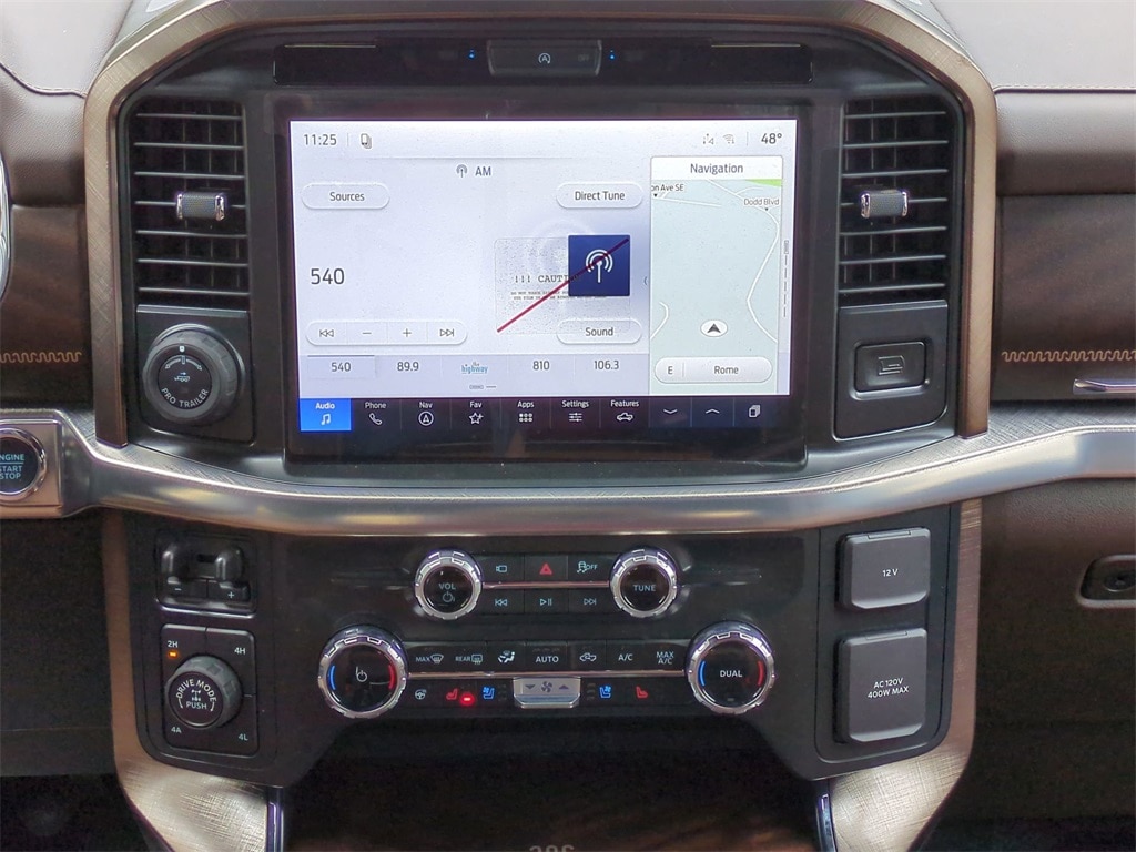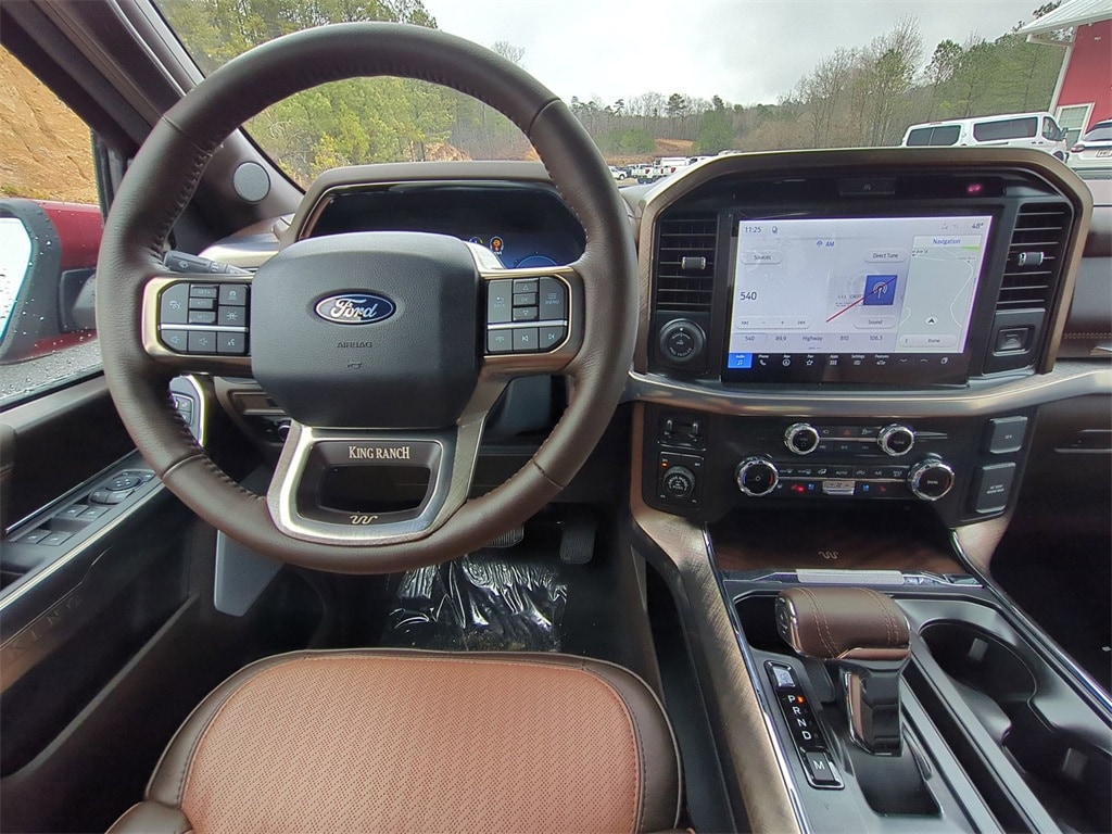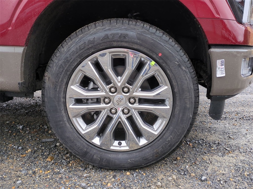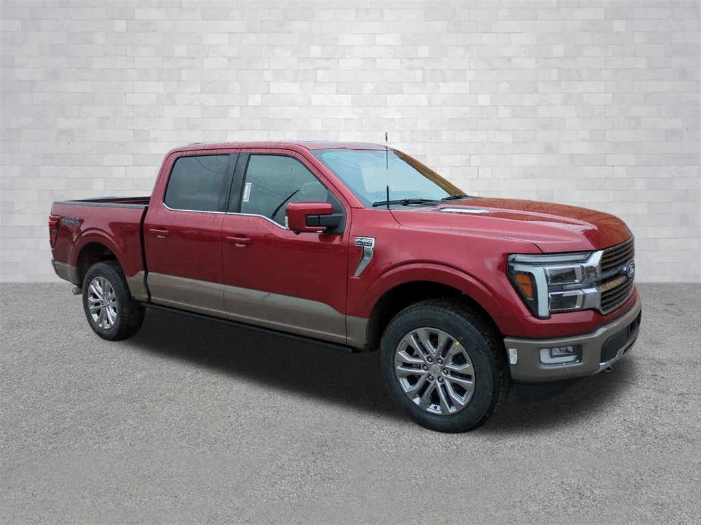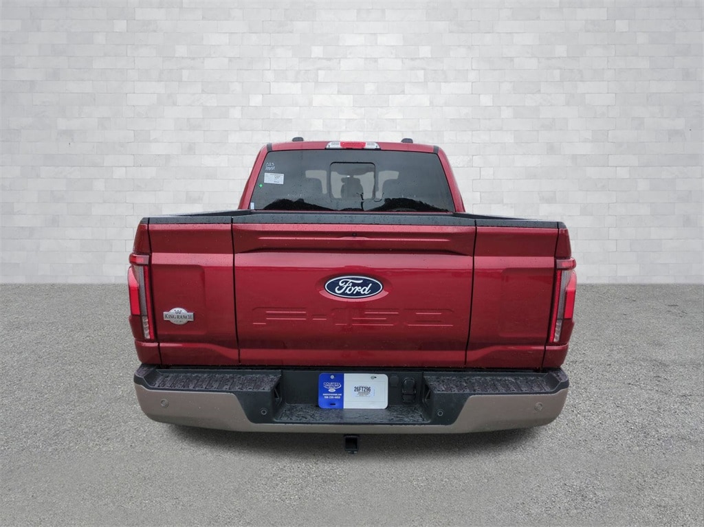 2026 Ruby Red Metallic Tinted Clearcoat 2026 Ford F-150 King Ranch 4WD 3.5L V6 EcoBoost 4WD. Ford Connectivity Package (1-Year Included), Internet access capable: 5G Modem - Ford Connectivity Package, 4WD, 4-Wheel Disc Brakes, 8 Speakers, ABS brakes, Adjustable pedals, Air Conditioning, Alloy wheels, AM/FM radio: SiriusXM with 360L, Auto High-beam Headlights, Auto tilt-away steering wheel, Auto-dimming door mirrors, Auto-dimming Rear-View mirror, Automatic temperature control, Brake assist, Chrome wheels, Compass, Delay-off headlights, Driver door bin, Driver vanity mirror, Dual front impact airbags, Dual front side impact airbags, Electronic Locking with 3.55 Axle Ratio, Electronic Stability Control, Emergency communication system: SYNC 4 911 Assist, Front anti-roll bar, Front Bucket Seats, Front Center Armrest, Front dual zone A/C, Front fog lights, Front reading lights, Front wheel independent suspension, Fully automatic headlights, Garage door transmitter, Genuine wood dashboard insert, Heated door mirrors, Heated front seats, Heated rear seats, Heated steering wheel, Illuminated entry, Leather steering wheel, Low tire pressure warning, Memory seat, Navigation system: Connected Navigation, Occupant sensing airbag, Outside temperature display, Overhead airbag, Overhead console, Panic alarm, Passenger door bin, Passenger vanity mirror, Pedal memory, Power door mirrors, Power driver seat, Power passenger seat, Power steering, Power windows, Radio data system, Radio: B&O Sound System by Bang and Olufsen, Rain sensing wipers, Rear reading lights, Rear seat center armrest, Rear step bumper, Rear window defroster, Remote keyless entry, Security system, Speed control, Split folding rear seat, Steering wheel memory, Steering wheel mounted audio controls, SYNC 4 with Enhanced Voice Recognition, Tachometer, Telescoping steering wheel, Tilt steering wheel, Traction control, Trip computer, Turn signal indicator mirrors, Variably intermittent wipers, Ventilated front seats, and Wheels: 20" Chrome-Like PVD Courtesy Ford and Lincoln of Rome 101 Hwy 411 E Rome, Ga 30161 ROMEFORDLINC.COM 706.235.4453.